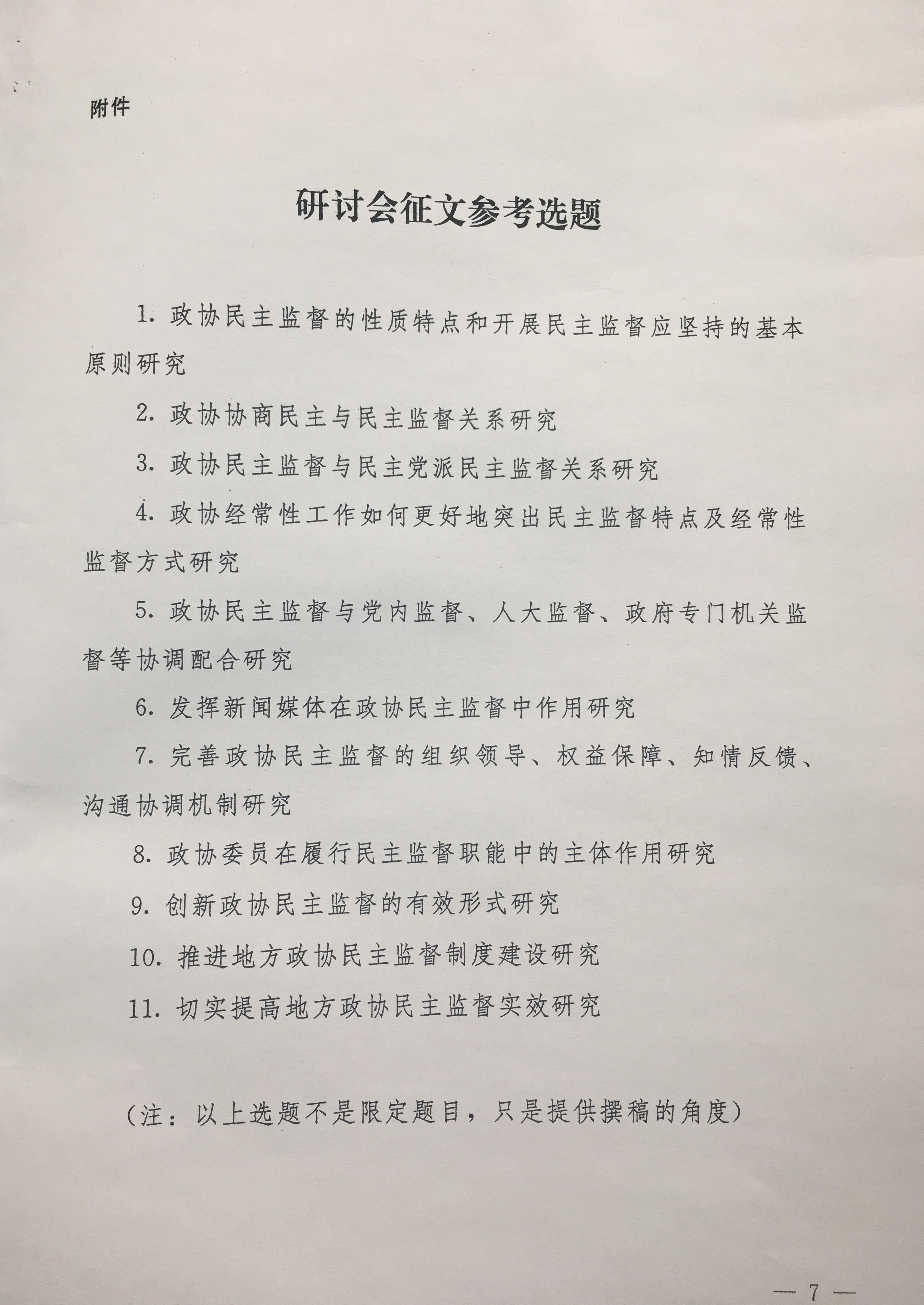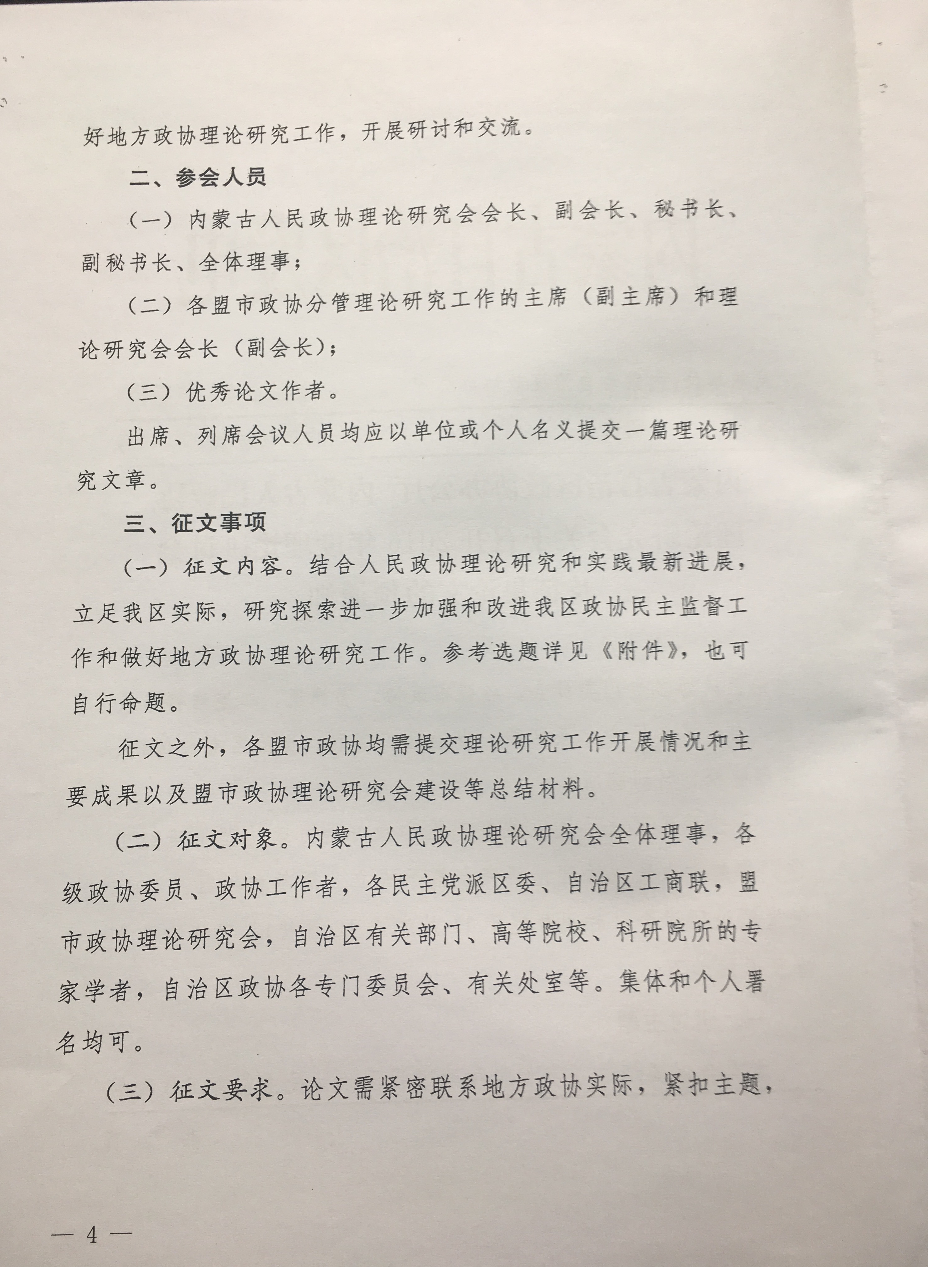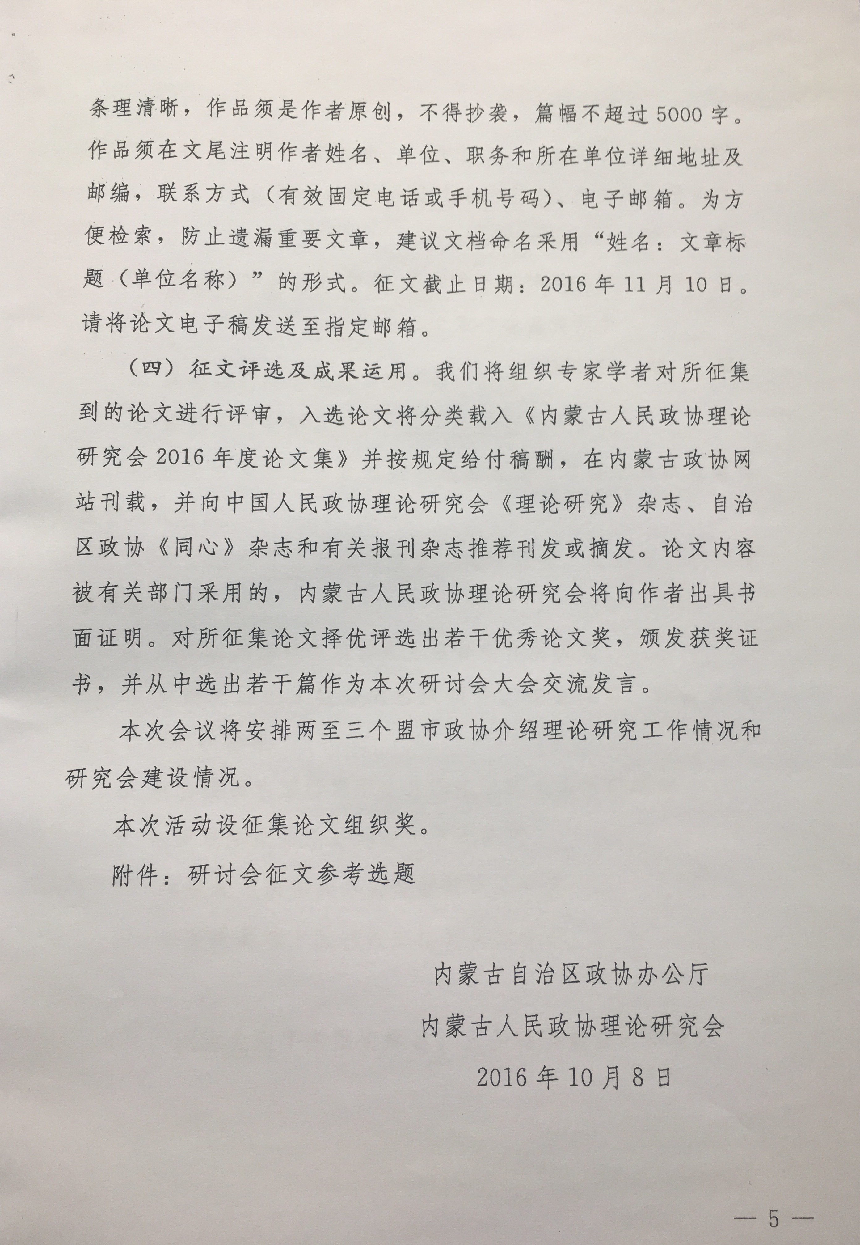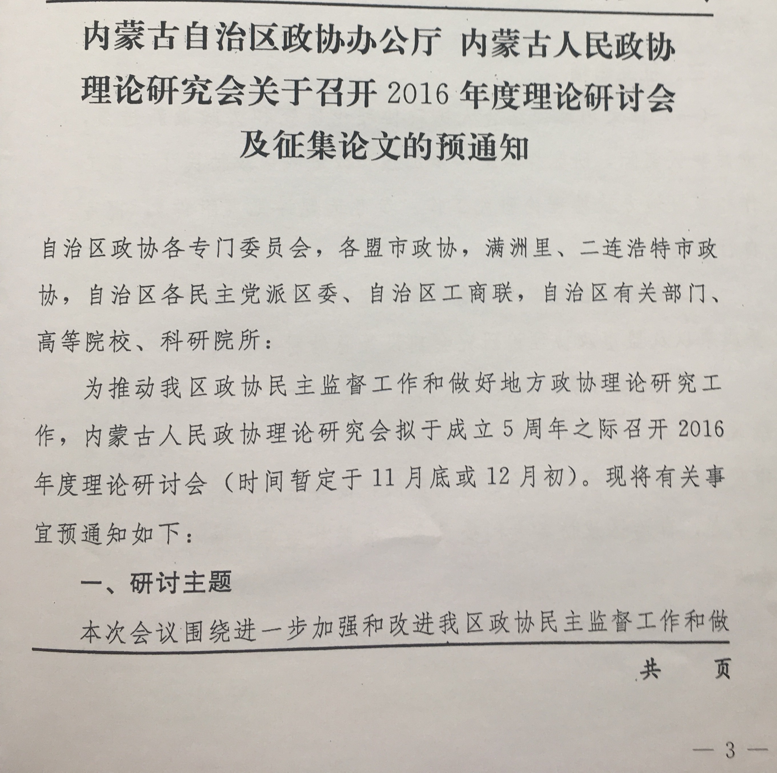 现将内蒙古自治区政协办公厅、内蒙古人民政协理论研究会《关于召开2016年度理论研究会及征集论文的预通知》(内政协办发〔2016〕185号)转发给你们,请结合实际,围绕进一步加强和改进政协民主监督工作和做好地方政协理论研究工作,认真撰写理论研究文章,于2016年11月5日前将论文注明作者姓名、单位、职务、联系电话和通讯地址,报送至包头市政协办公厅综合处。